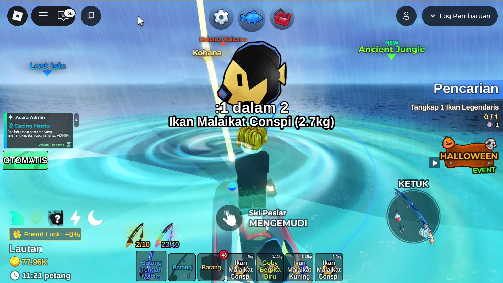 3. Gunakan joran (rod) dengan statistik Luck tertinggi yang dimiliki. Jangan lupa sematkan bobber atau boost (seperti Singularity atau Floral) untuk mendongkrak peluang kemunculan item Mythical.